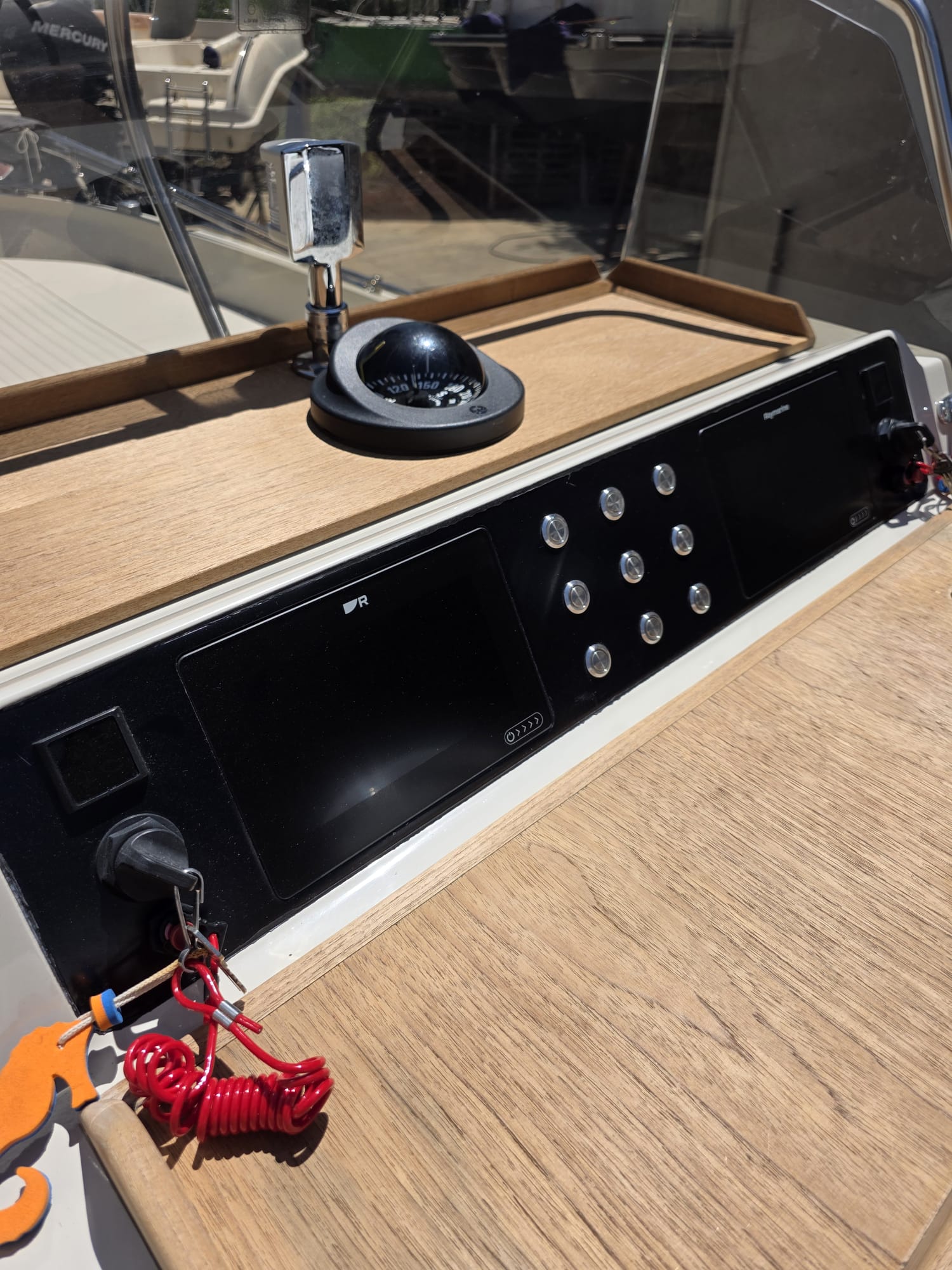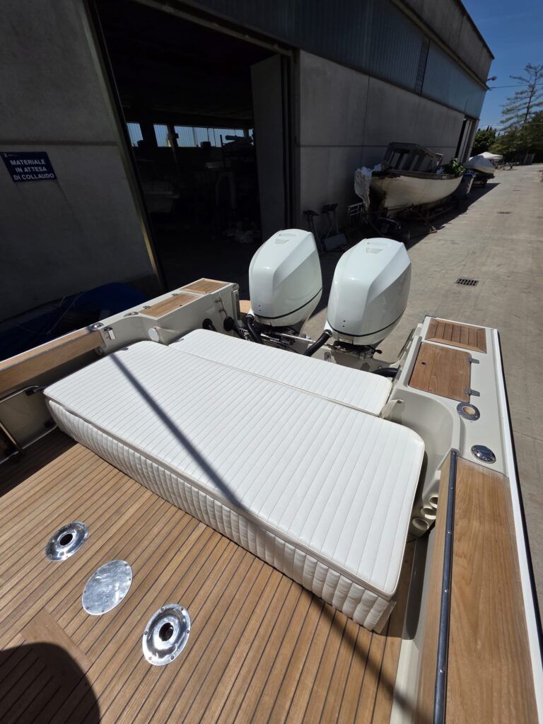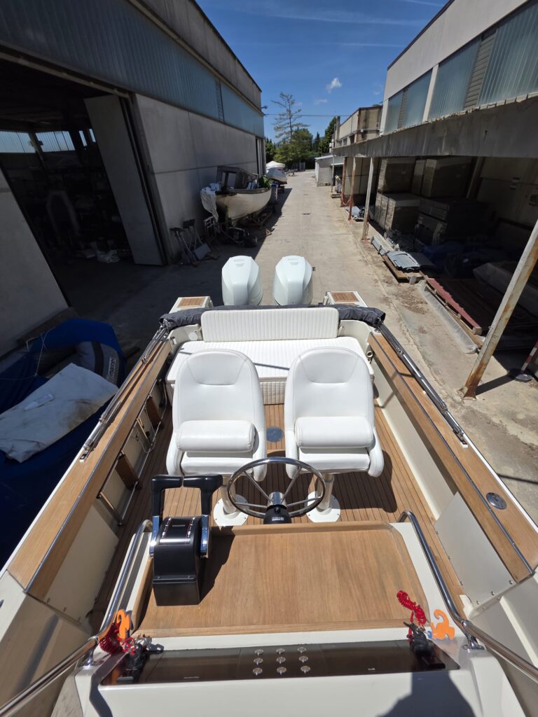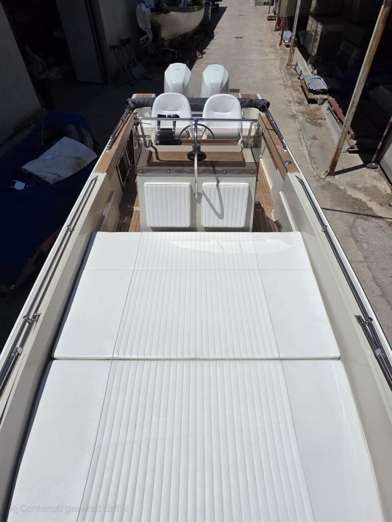 Cuscineria, copri cuscini di prua, copri consolle, due tendalini (quello di prua con estensioni), batterie, deviatori/interruttori batterie, idroguida ULTRAFLEX, tutto nuovo.